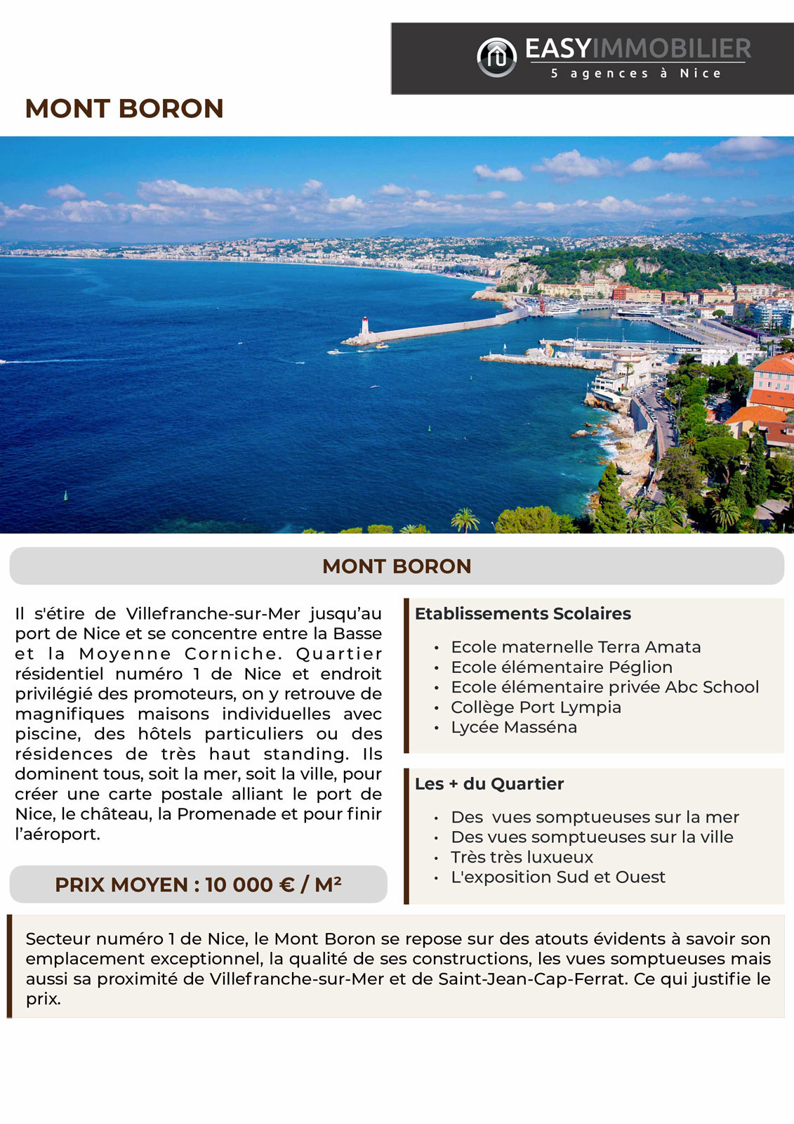 Secteur numéro 1 de Nice, le Mont Boron se repose sur des atouts évidents à savoir son emplacement exceptionnel, la qualité de ses constructions, les vues somptueuses mais aussi sa proximité de Villefranche-sur-Mer et de Saint-Jean-Cap-Ferrat. Ce qui justifie le prix.